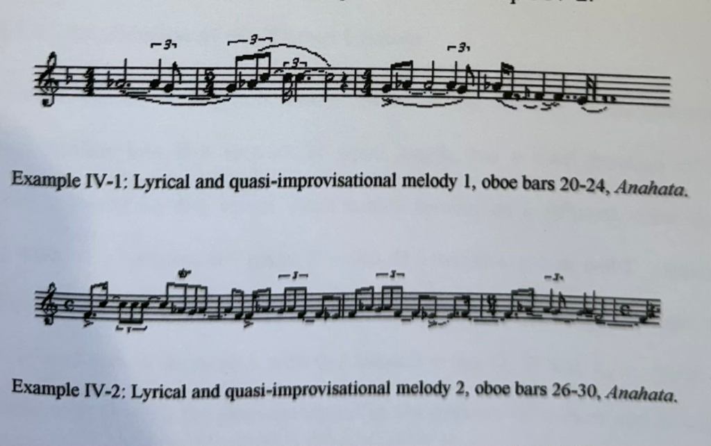 Anahata is comprised of five sections (A-E). Sections A and E are performed by the flute trio and utilise non-traditional techniques (including pitch bends, key clicks, colour fingerings and edge tones) to produce a representation of the important aspect of air. This group also provides the continuous F drone throughout the piece that links the music to the Heart Chakra. The pitch C is used as the peak of the two principal phrases (illustrated in Examples IV-1 and IV-2 below); the range is contained between the associated pitches of F and C (with the exception of the lower Eb, which serves to decorate the lowest extent of the ambit: F).