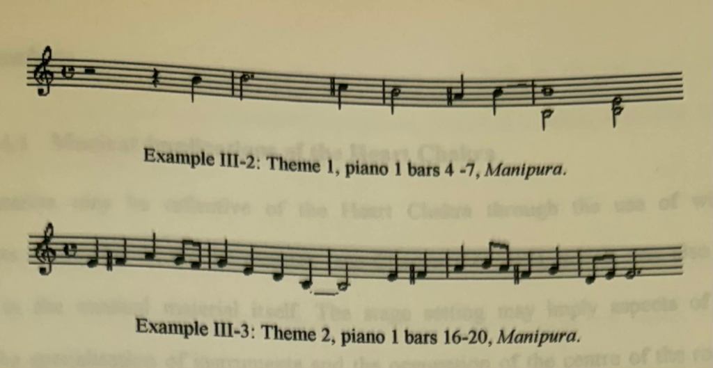 The pitches B and E are used as pedal points, whilst also being the tonal centres of theme 1 and theme 2 respectively. Being the third chakra and third movement in the work, the number three plays an important role in the foundation of Manipura: third intervals (of which tenth intervals [relative to lotus petals] are a type) are utilised throughout both themes and the piece is made up of three sections. After reviewing existent literature, it was decided that power (or control) was the key issue involved with the Abdominal Chakra, which also includes the opposite idea of freedom. Power is represented in these themes through the strong and steady nature of the melodies and the limited, or