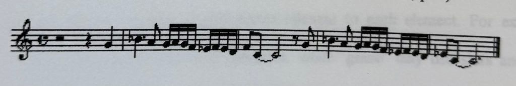 The numbers one (first chakra) and four (number of lotus petals) have been combined to create the five sections shown above, whilst intervals of one, four and five are used frequently throughout the piece. The introduction, conclusion and Muladhara theme (see example below) all represent security through controlled musical elements such as their use of ostinati and regular rhythmical patterns.